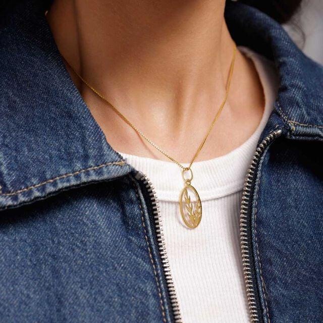 Opt for the leafy patterned gold pendant made from 18 KT yellow gold. The modern oval cut-out is a nature-inspired dream brought to reality, ideal for stacking with other chains and necklaces!